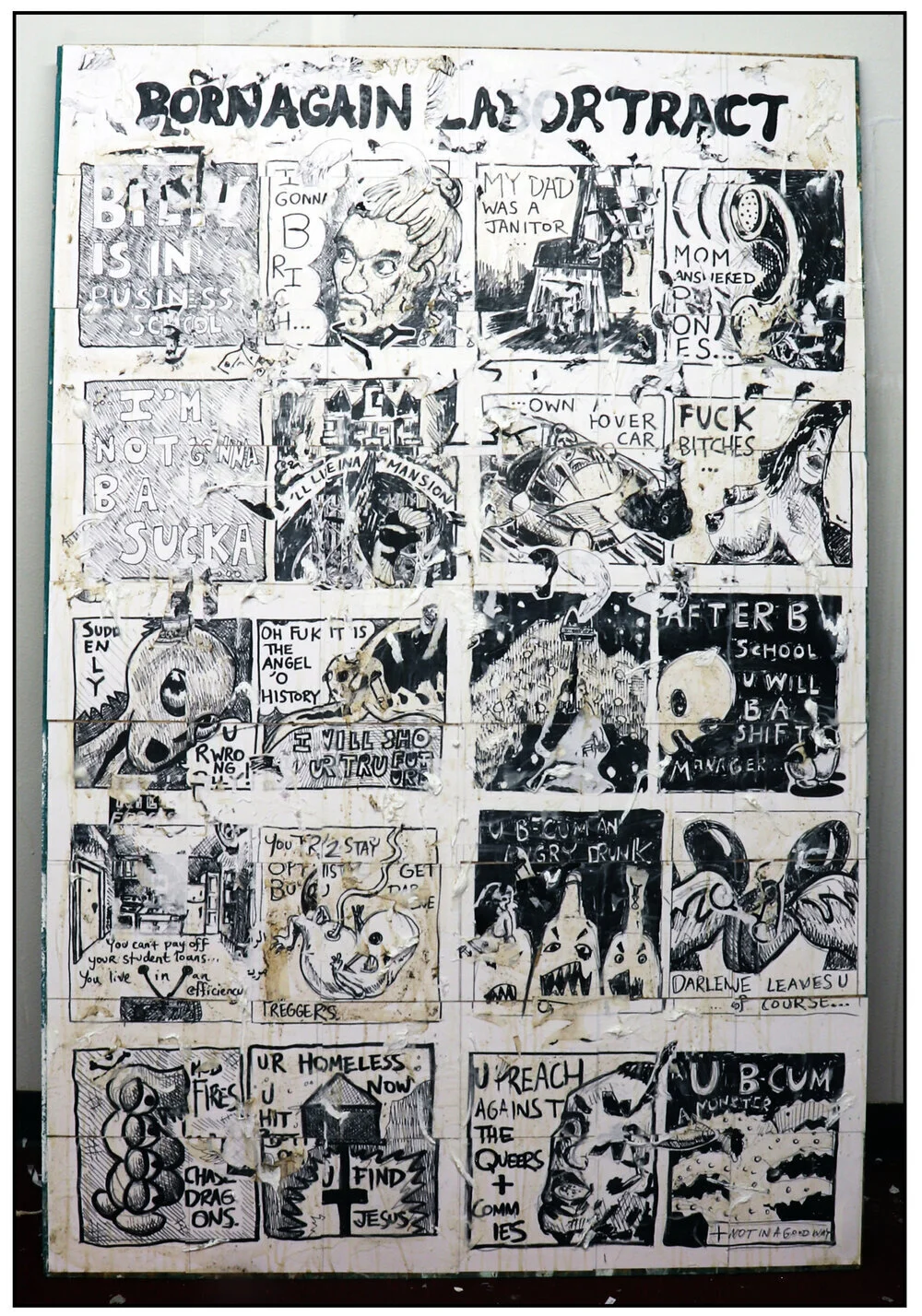 On display at BALM in fall 2019. Materials: Photocopies and digital prints, collage, stickers, coffee, glitter, ink, Sharpie, acrylic and mixed-media, cotton and ash on paper and mounted on wood. Acquired in 2019. Featured in Locust #1.